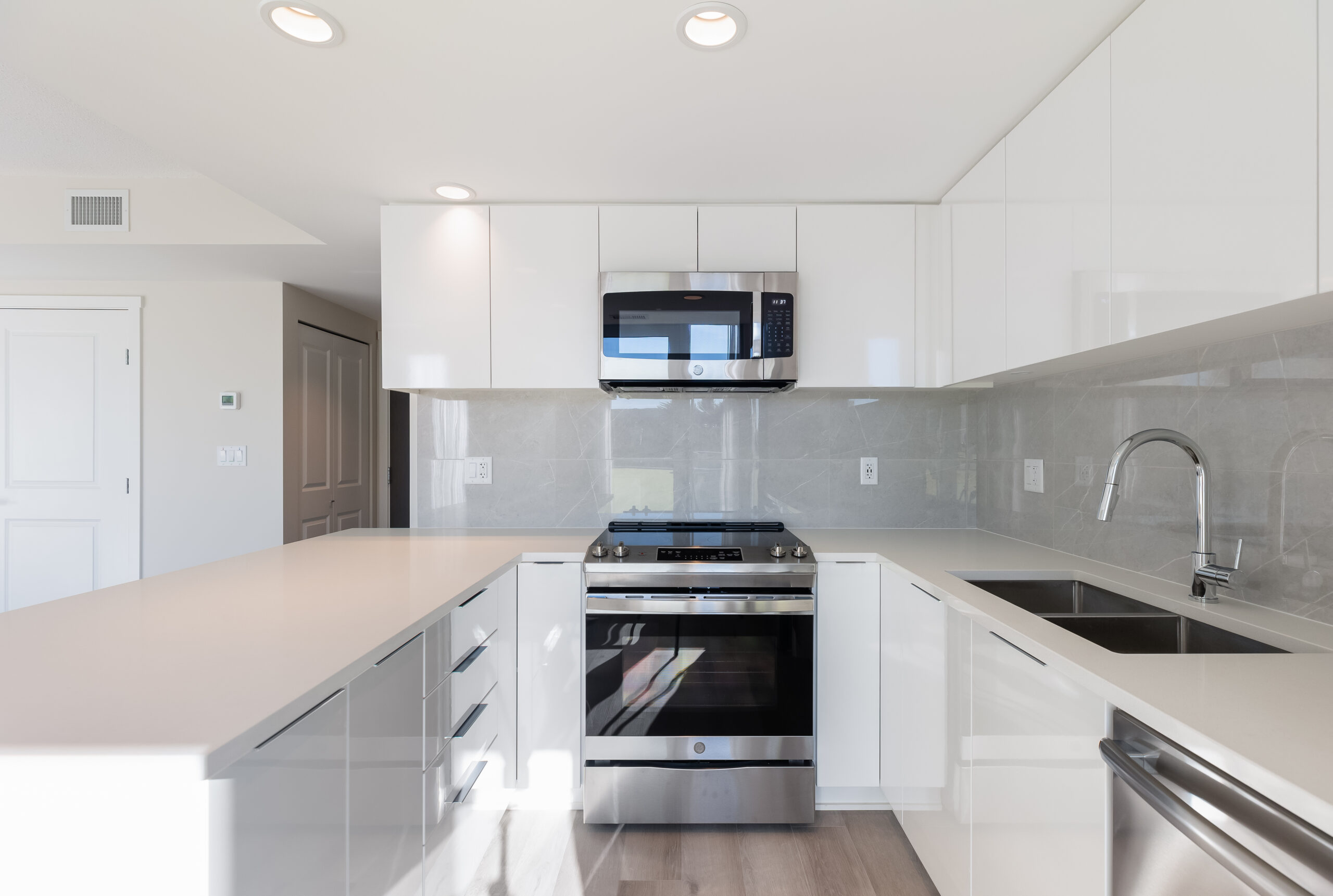 • Custom cabinetry is complemented by engineered stone countertops, sleek polished chrome pulls, and under-cabinet lighting