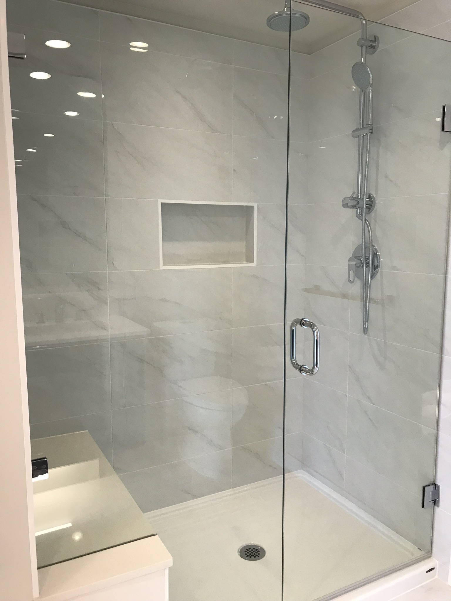 • Step into an oversized spa-style shower with frameless shower doors, a rainshower head (all ensuites and most second bathrooms), built-in niche and integrated bench seating.