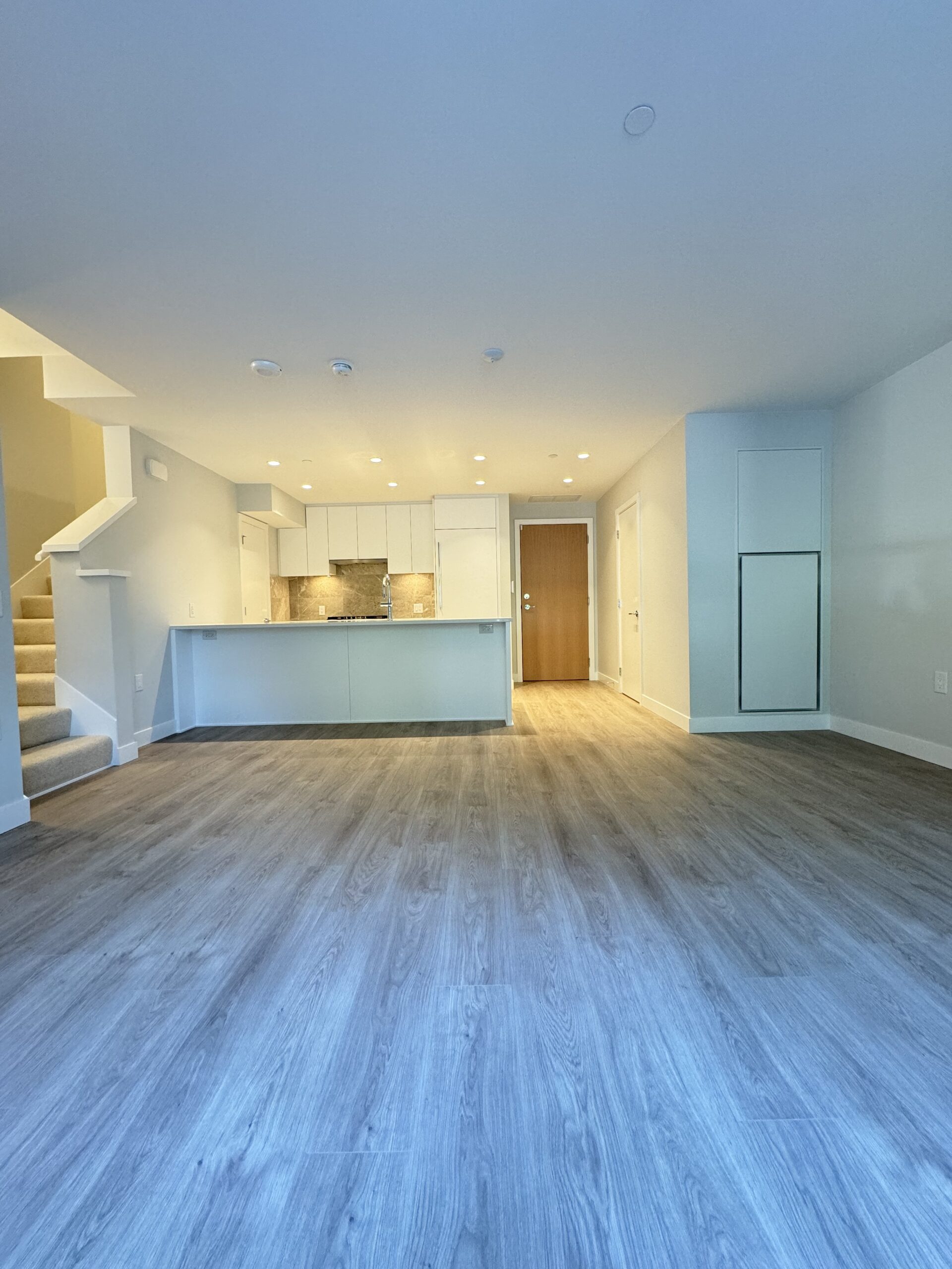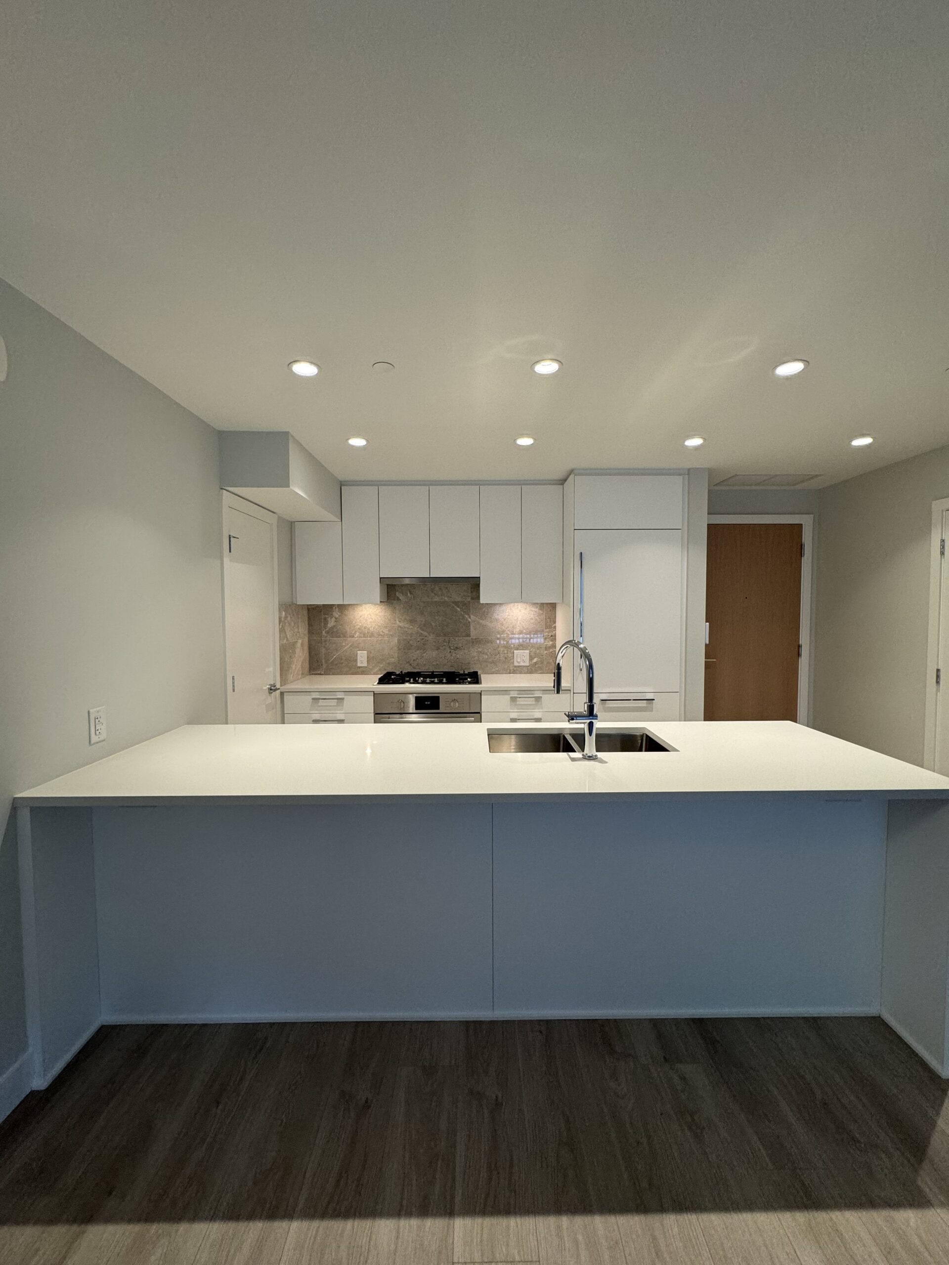 - Sleek recessed lighting beautifully illuminates the kitchen and entry area